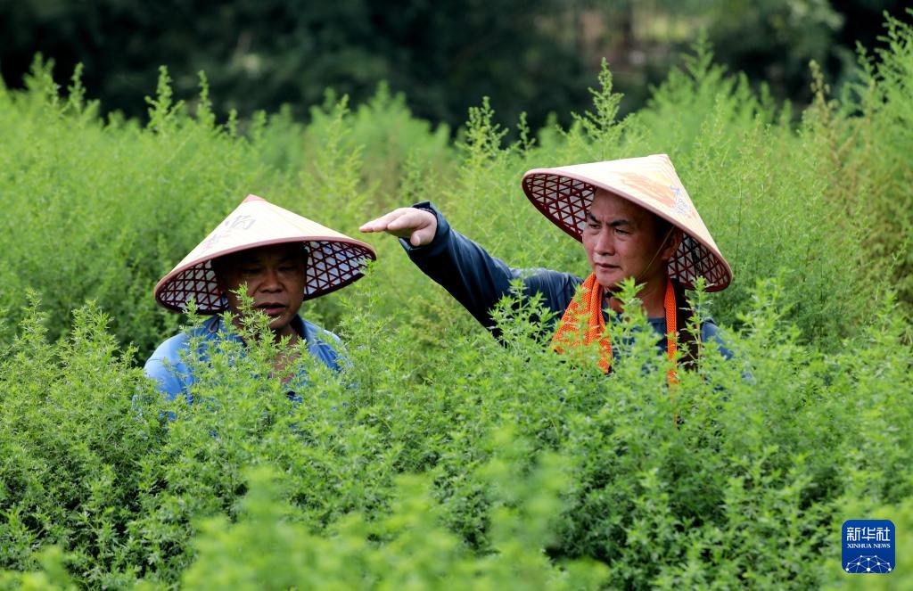 在廣西仙草堂制藥有限責任公司基地,工人在查看青蒿生長情況(8月28日攝)。