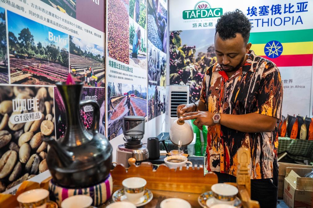 7月24日,在第八屆南博會咖啡產(chǎn)業(yè)館,一名埃塞俄比亞展商在沖泡咖啡。(新華社記者胡超攝)
