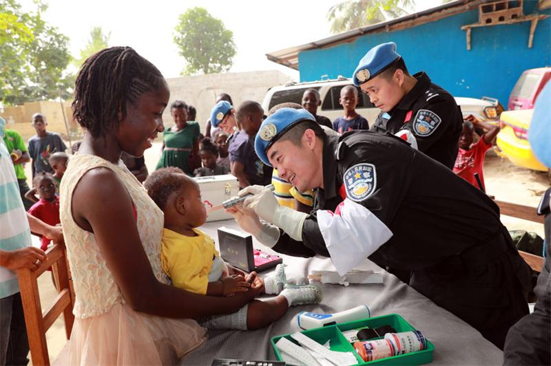 2017年12月28日,在利比里亞蒙羅維亞,中國維和警察防暴隊醫(yī)療人員為兒童做口腔檢查。