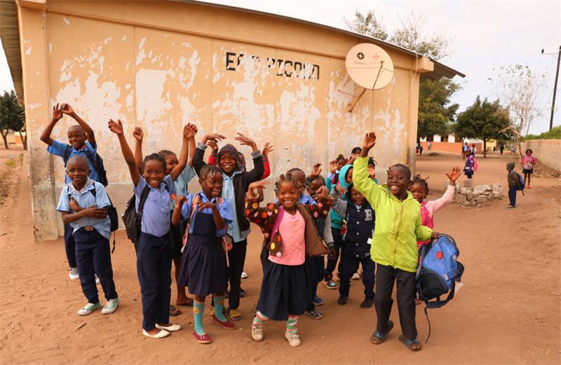 2023年7月25日,莫桑比克馬普托省皮科科村學(xué)校的孩子們站在裝有中國援助的衛(wèi)星電視接收天線的房屋前?!叭f村通”項目旨在為非洲國家的1萬個村莊接入衛(wèi)星數(shù)字電視信號,項目2018年在莫桑比克啟動,為該國1000個村落、2萬戶家庭和3000個公共場所安裝衛(wèi)星電視設(shè)備,提供電視信號和節(jié)目,覆蓋農(nóng)村人口達(dá)250萬。新華社記者 董江輝 攝