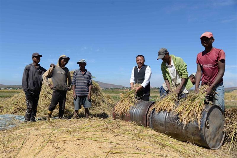 在馬達(dá)加斯加首都塔那那利佛附近的馬義奇鎮(zhèn),中國雜交水稻技術(shù)專家胡月舫(右三)在中國國家雜交水稻工程技術(shù)研究中心非洲分中心的試驗田里和當(dāng)?shù)剞r(nóng)民一起收獲水稻(2023年5月12日攝)。新華社發(fā)(西塔卡·拉喬納里松 攝)