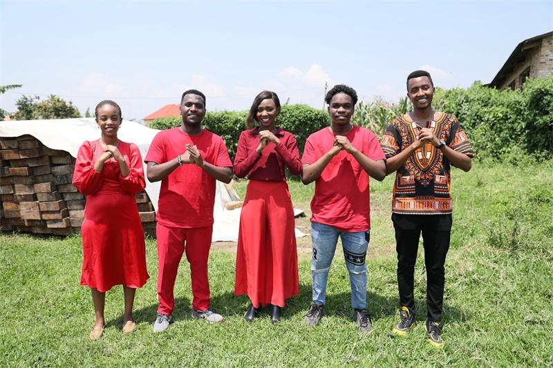 2024年2月7日,在盧旺達(dá)南方省卡莫尼地區(qū),盧旺達(dá)青年團隊成員向鏡頭前觀眾送上新春祝福。新華社發(fā)(黃萬晴 攝)