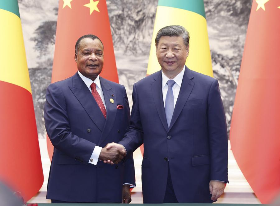 9月6日上午,國家主席習近平在北京人民大會堂同來華出席中非合作論壇北京峰會并進行國事訪問的剛果(布)總統(tǒng)薩蘇舉行會談。這是會談后,兩國元首共同見證簽署多項雙邊合作文件。