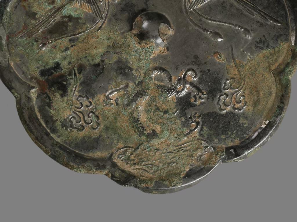 銅鏡呈八瓣葵花形,在中央的鏡鈕四周,自下而上分三個(gè)部分構(gòu)成了由水面到天空的立體空間。最下層為波光粼粼的一汪水面,雖然這一部分留存有因長(zhǎng)期埋藏地下而產(chǎn)生的銹跡,但仍依稀可辨碧波之上有一條昂首翹尾的龍。它四肢張開,龍尾反折向龍首上方并纏繞于一足之上,龍身兩側(cè)各一朵祥云,襯托出神龍騰躍翻飛的身姿。