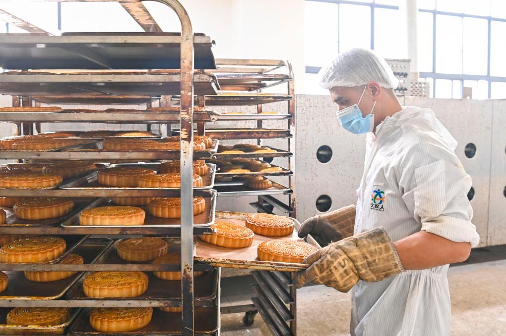 9月11日,在廣西北海市合浦縣的月餅小鎮(zhèn)一處生產車間內,工人將烤好的月餅取出等待冷卻。(林啟波 攝)