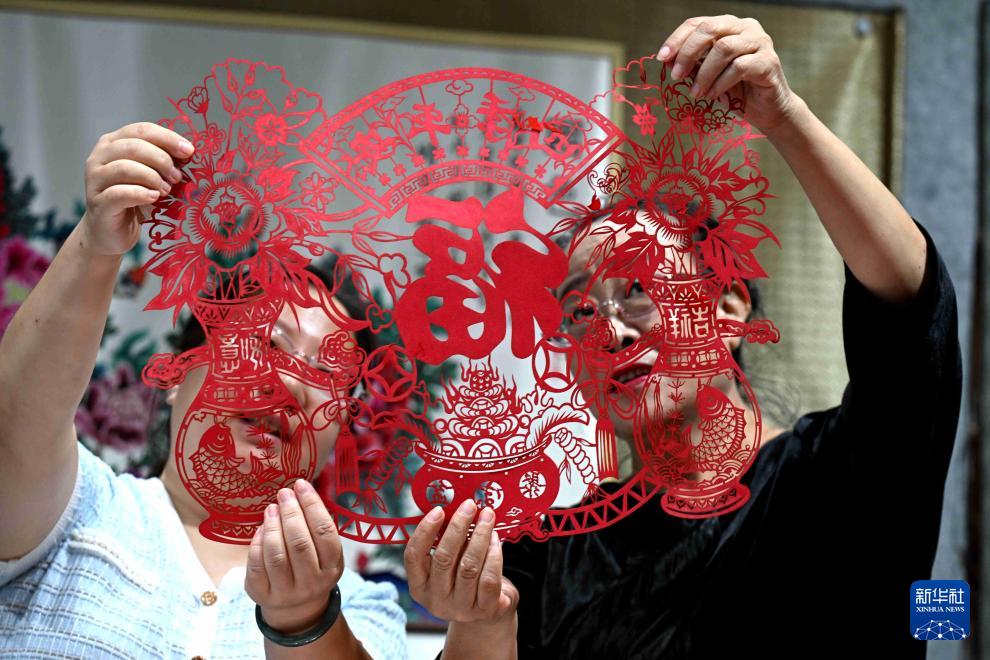9月27日,河北省石家莊市蔚縣剪紙國(guó)家級(jí)代表性傳承人周淑英(右)在“展非遺 迎國(guó)慶”系列主題活動(dòng)中展示剪紙作品。