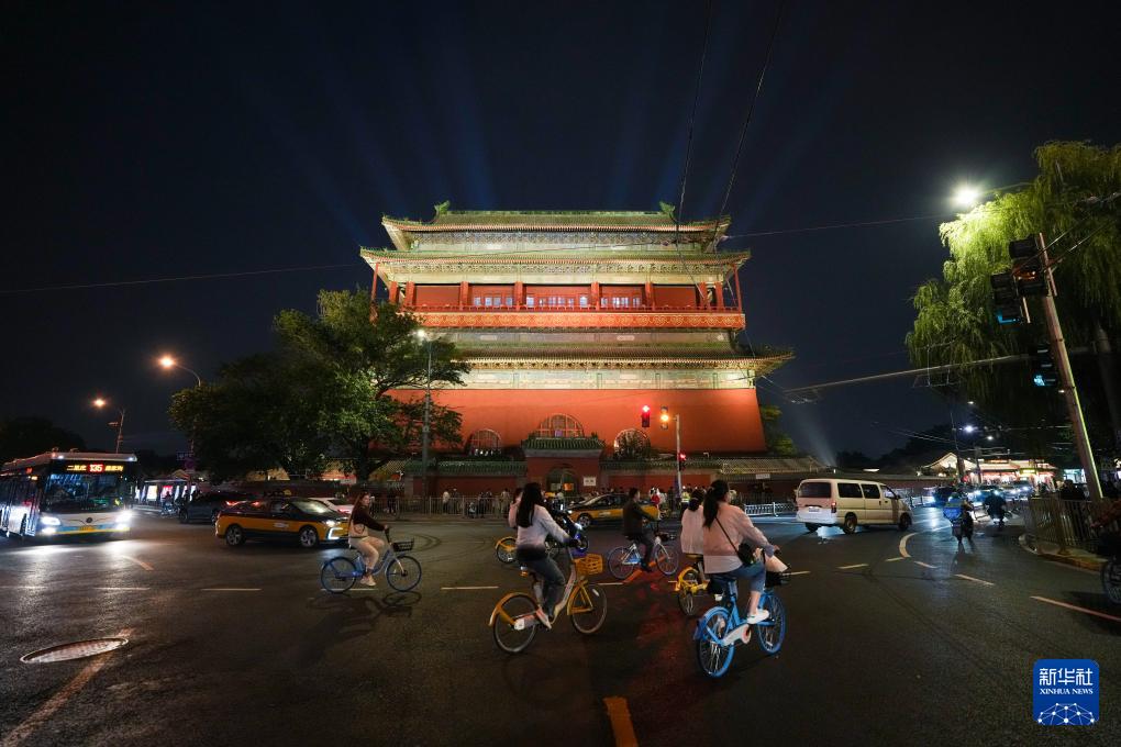 游客在完成景觀照明設(shè)施提升后亮燈的鼓樓前參觀游覽(9月26日攝)。