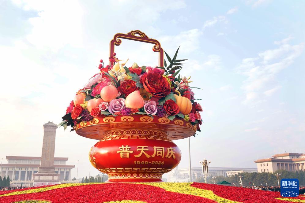 9月25日拍攝的天安門(mén)廣場(chǎng)“祝福祖國(guó)”巨型花籃。
