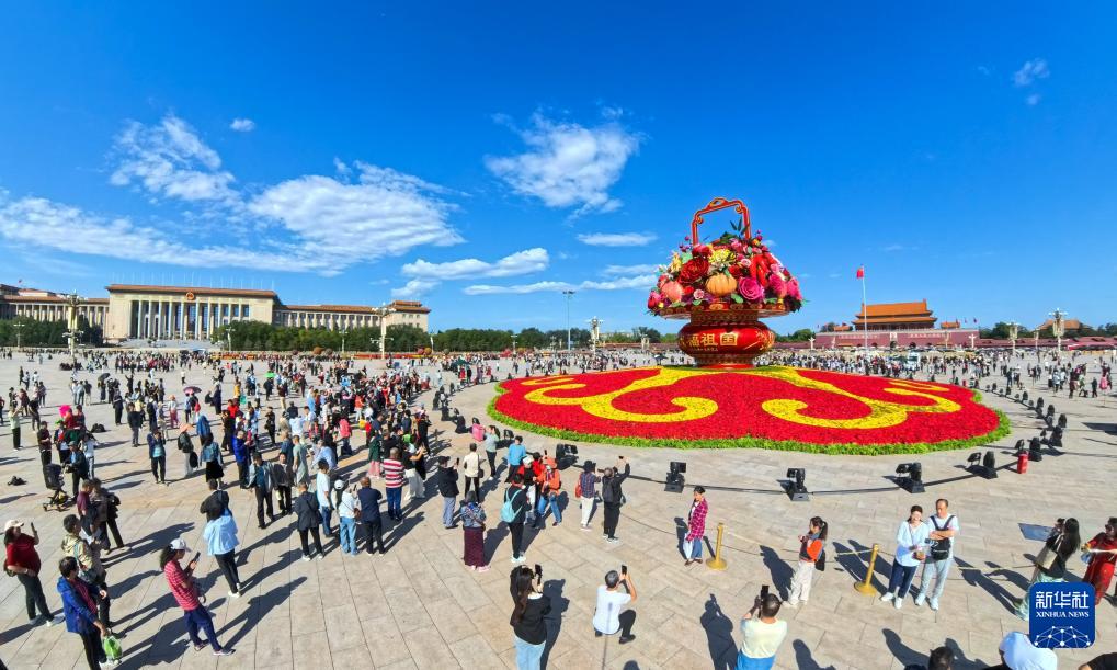 9月25日,游客在天安門廣場觀賞“祝福祖國”巨型花籃。