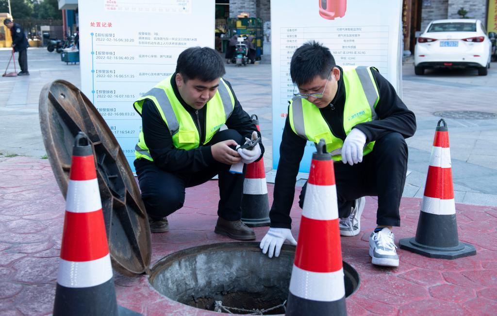 11月7日,運維人員在檢查井內(nèi)的可燃氣體監(jiān)測儀。新華社記者 傅天 攝