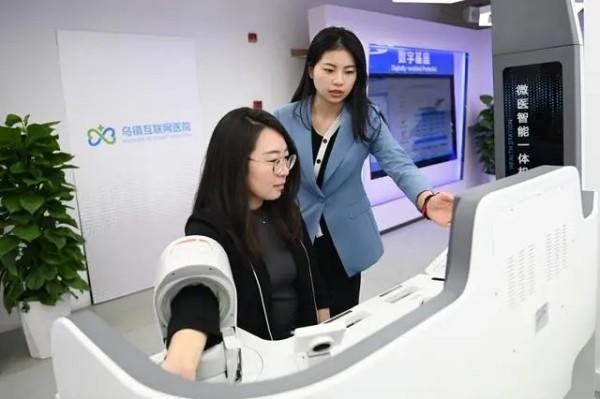 2023年11月,參觀者在烏鎮(zhèn)互聯(lián)網(wǎng)醫(yī)院體驗智能一體機的體檢功能,并與醫(yī)生進行視頻連線。