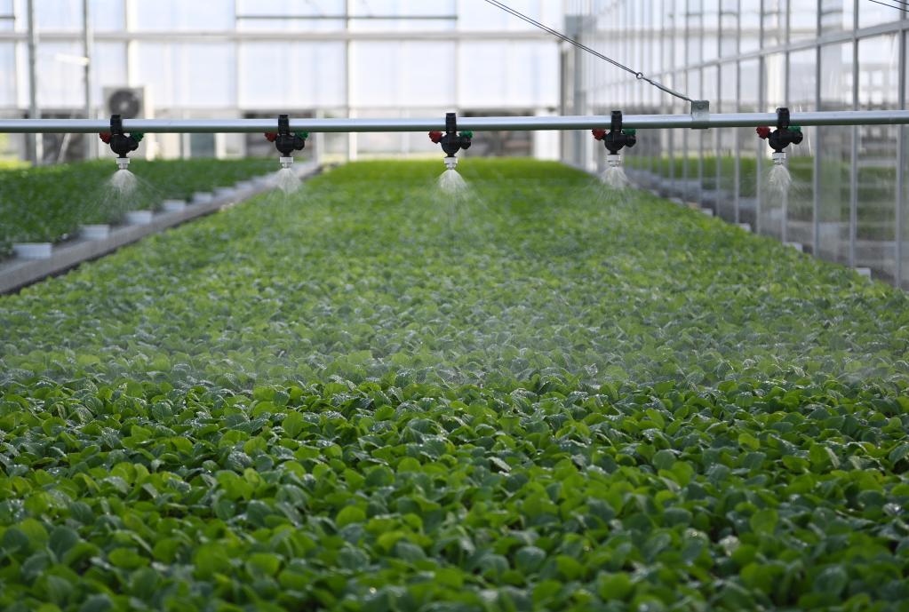 12月2日,在謝徑安·傳化農(nóng)創(chuàng)村植物科學(xué)中心里,自動(dòng)噴灌系統(tǒng)在數(shù)字種苗工廠內(nèi)灌溉育苗。新華社記者 盧哲 攝