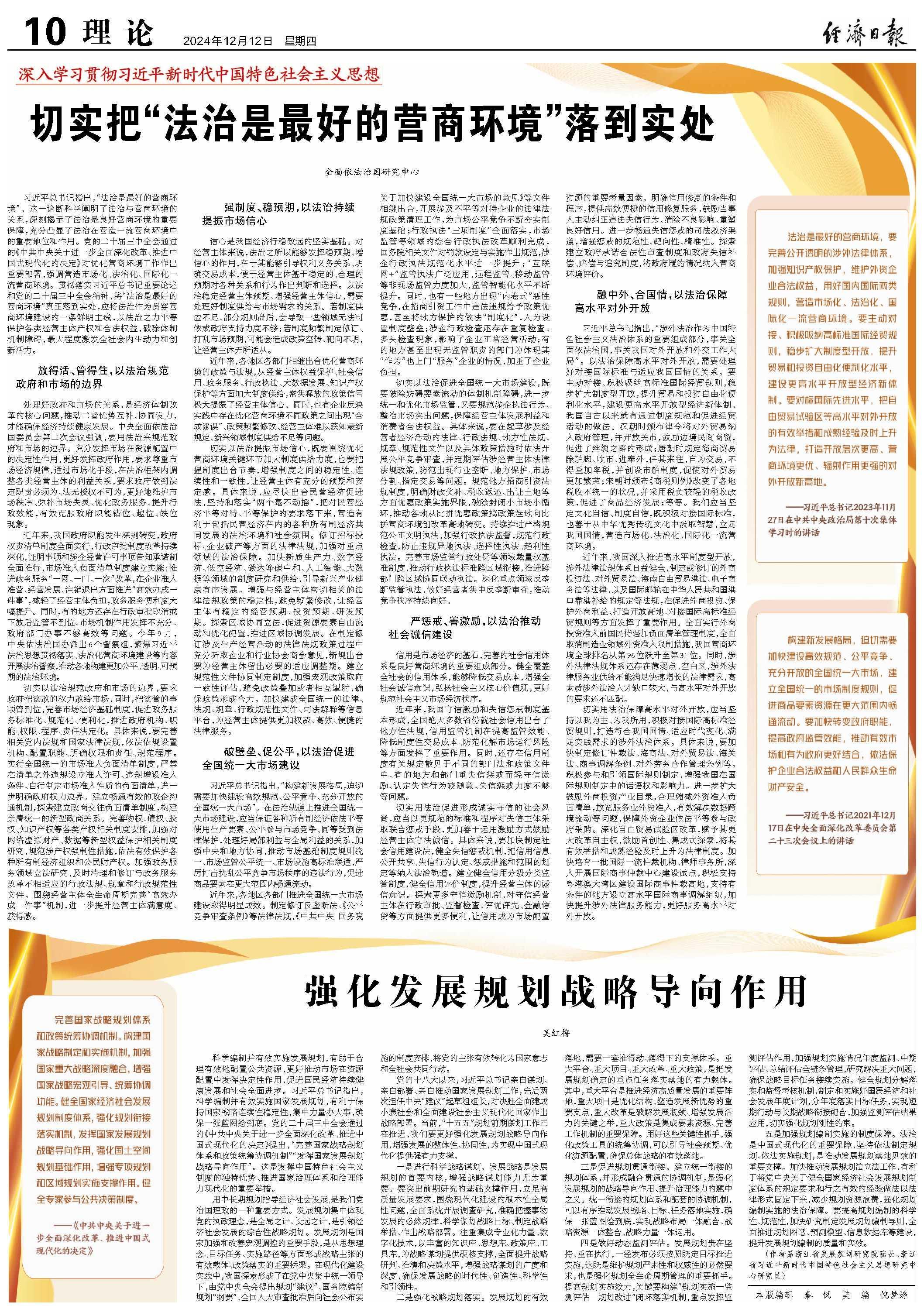 習(xí)近平總書(shū)記指出,“法治是最好的營(yíng)商環(huán)境”。這一論斷科學(xué)闡明了法治與營(yíng)商環(huán)境的關(guān)系,深刻揭示了法治是良好營(yíng)商環(huán)境的重要保障,充分凸顯了法治在營(yíng)造一流營(yíng)商環(huán)境中的重要地位和作用。黨的二十屆三中全會(huì)通過(guò)的《中共中央關(guān)于進(jìn)一步全面深化改革、推進(jìn)中國(guó)式現(xiàn)代化的決定》對(duì)優(yōu)化營(yíng)商環(huán)境工作作出重要部署,強(qiáng)調(diào)營(yíng)造市場(chǎng)化、法治化、國(guó)際化一流營(yíng)商環(huán)境。貫徹落實(shí)習(xí)近平總書(shū)記重要論述和黨的二十屆三中全會(huì)精神,將“法治是最好的營(yíng)商環(huán)境”真正落到實(shí)處,應(yīng)將法治作為貫穿營(yíng)商環(huán)境建設(shè)的一條鮮明主線,以法治之力平等保護(hù)各類經(jīng)營(yíng)主體產(chǎn)權(quán)和合法權(quán)益,破除體制機(jī)制障礙,最大程度激發(fā)全社會(huì)內(nèi)生動(dòng)力和創(chuàng)新活力。