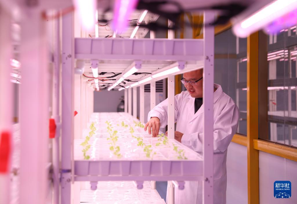 12月25日,在位于河南新鄉(xiāng)的中原農(nóng)谷植物工廠,科研人員查看培育的生菜苗。