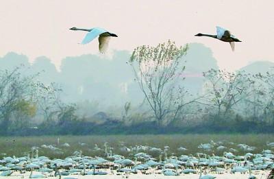 小天鵝在湖南岳陽市東古湖濕地上空飛翔。近年來,該地實(shí)施退耕還濕等工程,吸引越來越多候鳥來此越冬棲息。曹正平攝/光明圖片