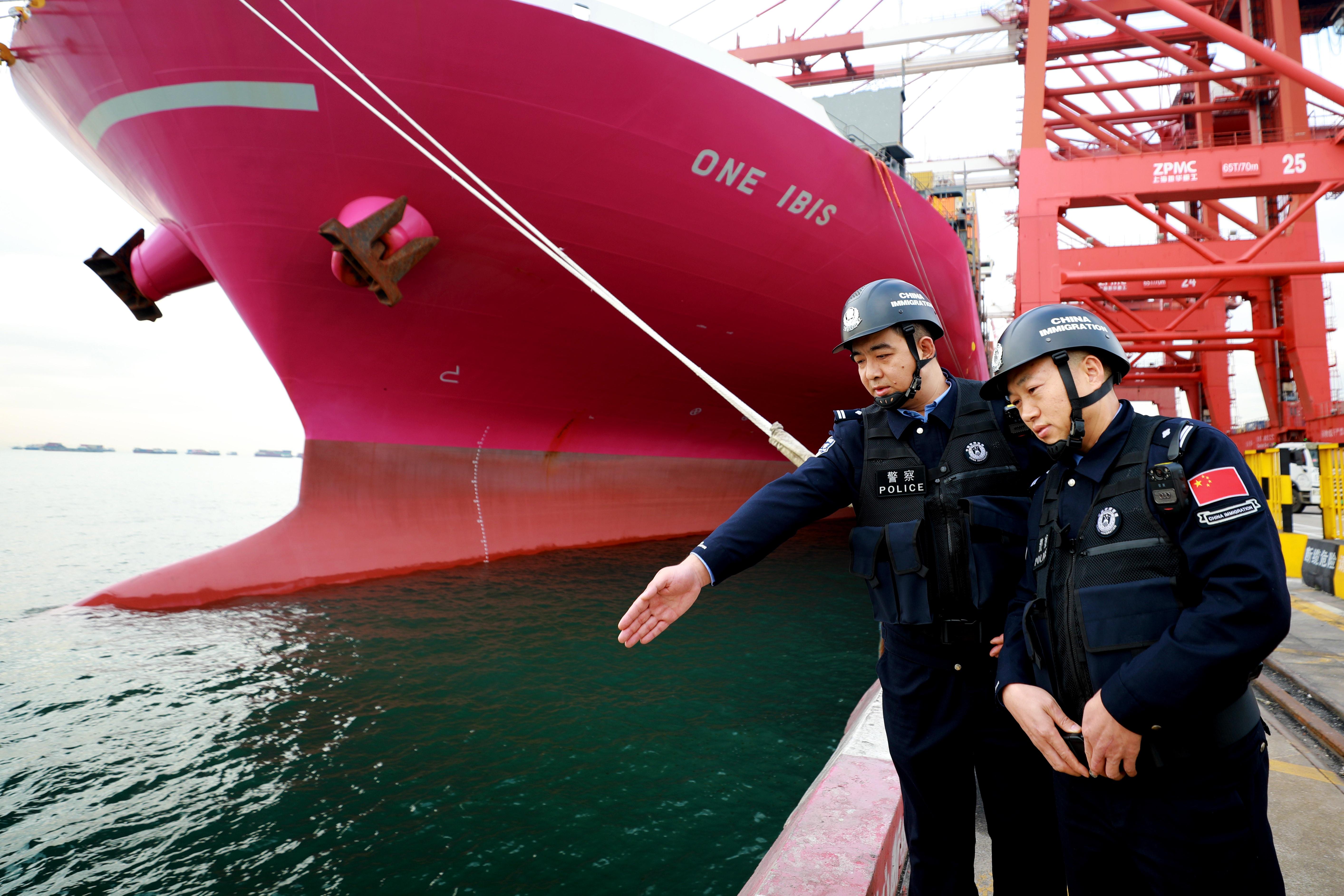 幾十米高的舷梯倚著船體,身著救生衣的劉洪洲雙手緊握欄桿,小心翼翼地一步步登上舷梯,到達船艙。今天是一名中國籍船東要下船,人證對照無誤后,劉洪洲仔細檢查行李箱內(nèi)物品,全部核查沒有問題后,登記放行。