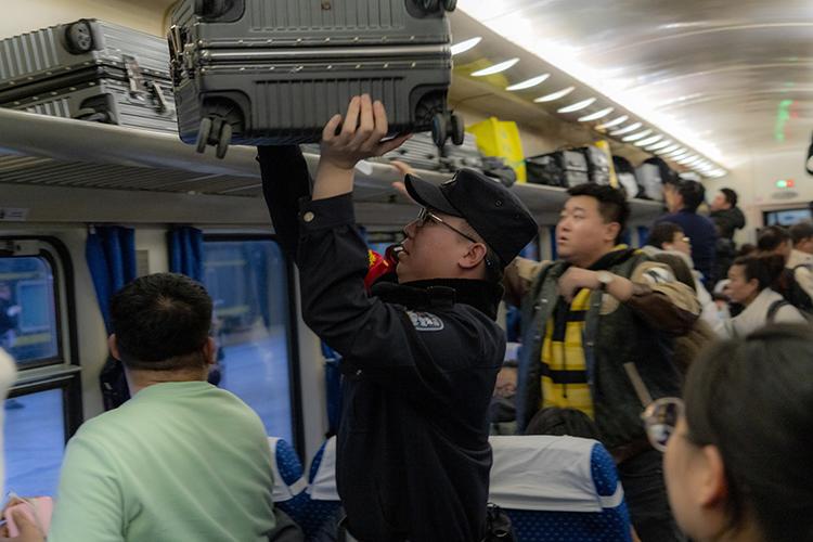 為了滿足大量旅客的出行需求,K27次列車特別增設(shè)至16節(jié)車廂,全車載有超過1000名旅客。沃荻從協(xié)助旅客托運(yùn)行李,到確保行李擺放整齊、安全;從白天維持車廂內(nèi)秩序,到夜間巡查提醒旅客保管好個(gè)人財(cái)物……旅途中的每一件小事,他都親力親為,從不馬虎。