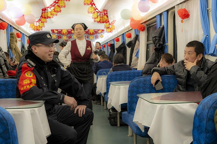 沃荻值乘的K27次列車從北京發(fā)往遼寧丹東,單次往返耗時(shí)兩天,他需要連續(xù)值乘兩個(gè)來回,共計(jì)4天。春運(yùn)期間,旅客數(shù)量激增,沃荻的工作量也隨之加大。“春運(yùn)期間旅客特別多,比平時(shí)要操心許多,我們的職責(zé)就是確保每一位旅客安全返鄉(xiāng)”。