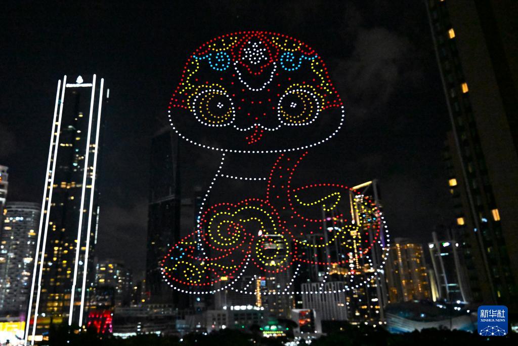 1月25日,在馬來西亞吉隆坡舉行的2025年“歡樂春節(jié)”全球啟動儀式前,無人機展示蛇年主題圖案。