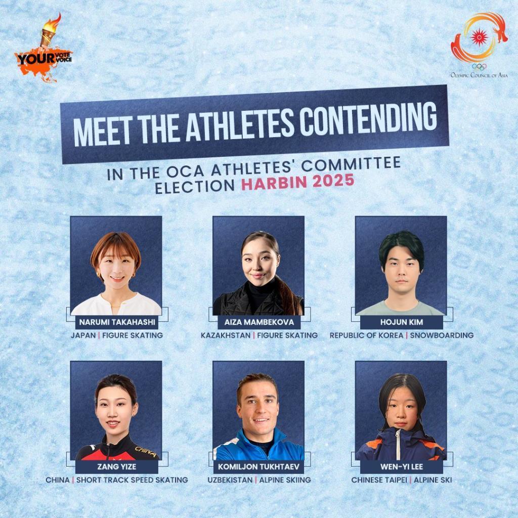 這6名候選人是:日本花樣滑冰運(yùn)動(dòng)員高橋成美、哈薩克斯坦花樣滑冰運(yùn)動(dòng)員艾莎·曼別科娃、韓國(guó)單板滑雪運(yùn)動(dòng)員金浩俊、中國(guó)短道速滑運(yùn)動(dòng)員臧一澤、烏茲別克斯坦高山滑雪運(yùn)動(dòng)員科米爾忠·圖赫塔耶夫、中國(guó)臺(tái)北高山滑雪運(yùn)動(dòng)員李玟儀。