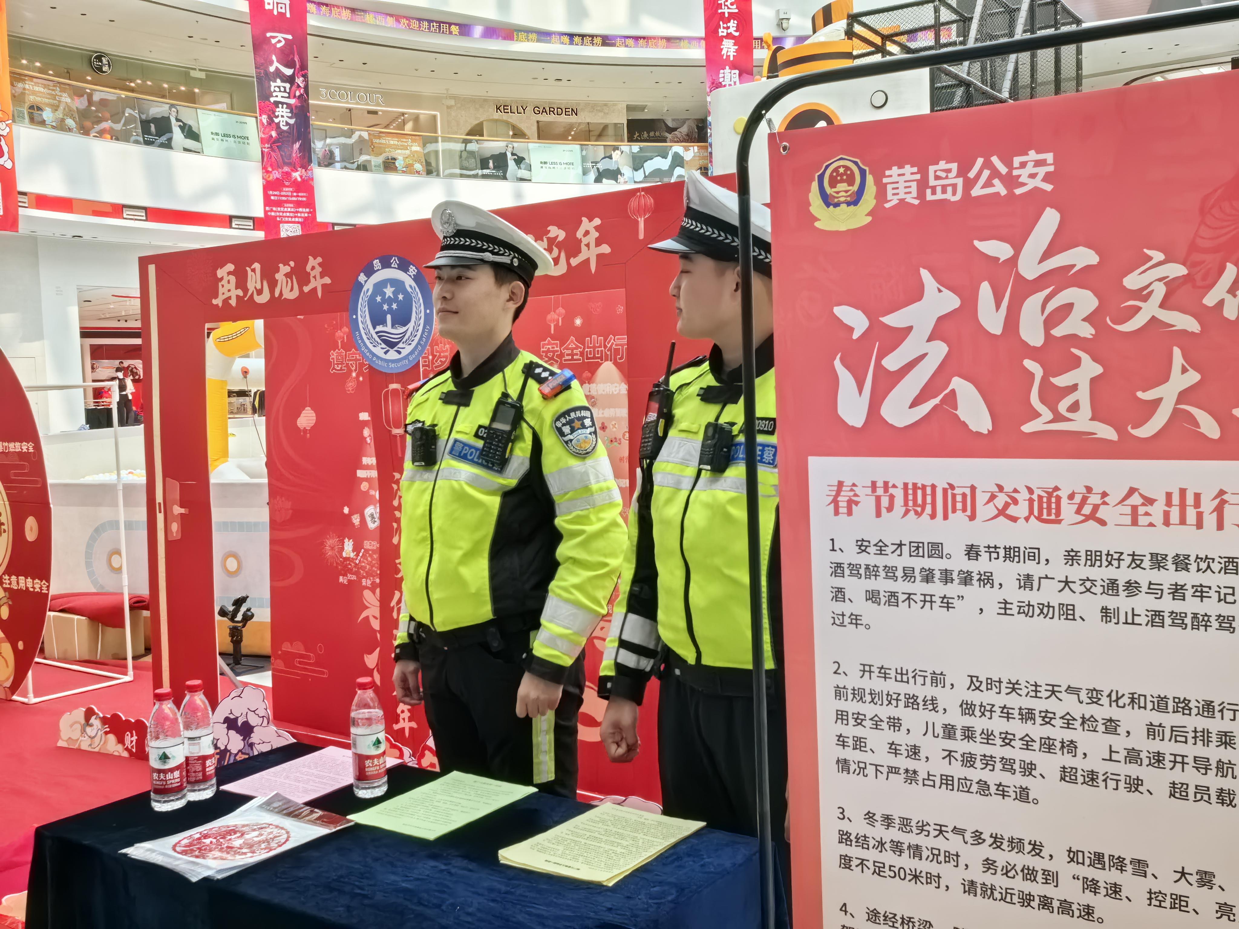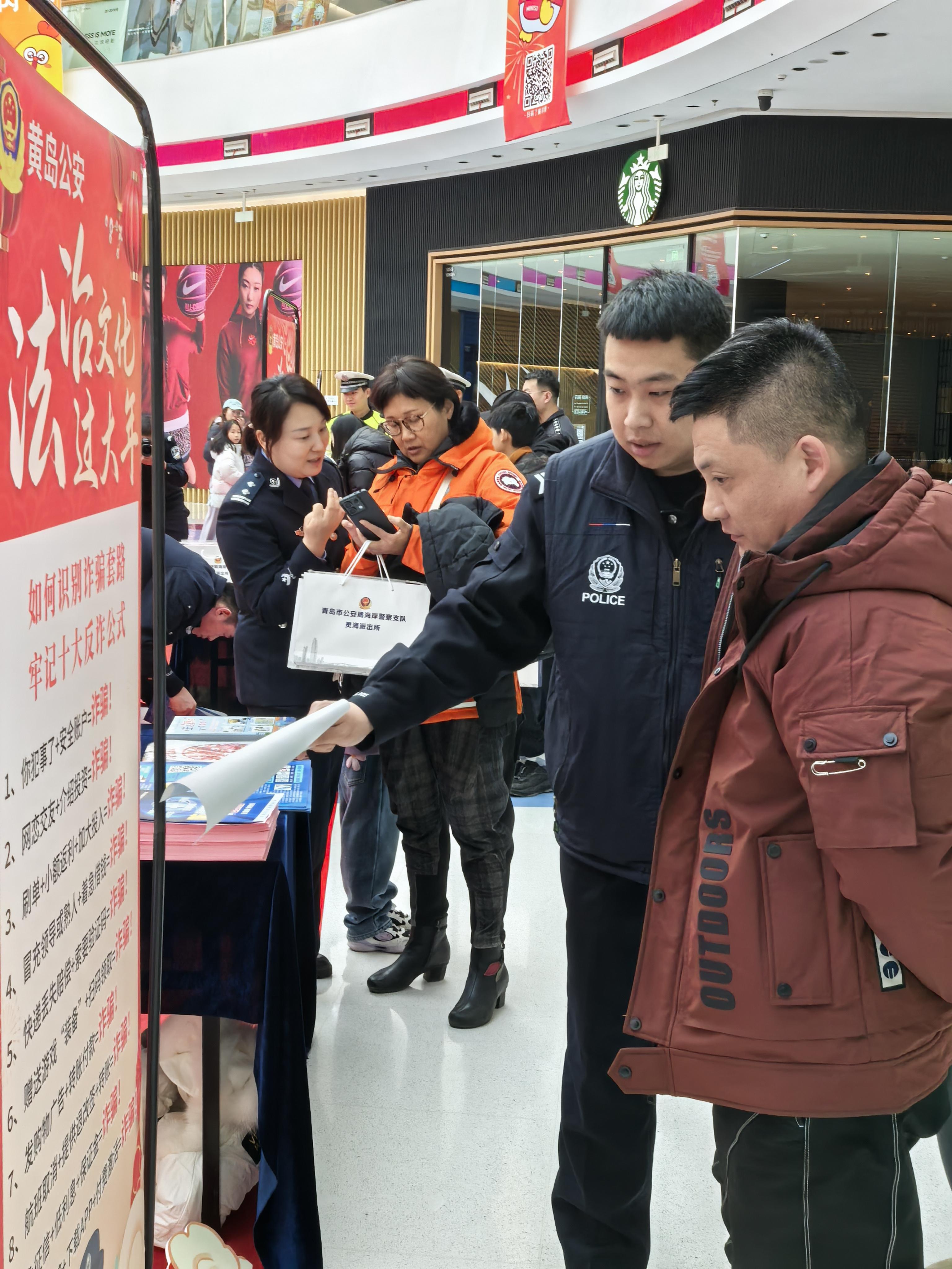 新春佳節(jié),山東省青島市黃島區(qū)某大型商場內(nèi)張燈結(jié)彩,人頭攢動(dòng),洋溢著濃濃的節(jié)日氛圍。在商場中央展廳,黃島公安組織的“法治文化過大年”宣傳活動(dòng)正如火如荼地進(jìn)行。