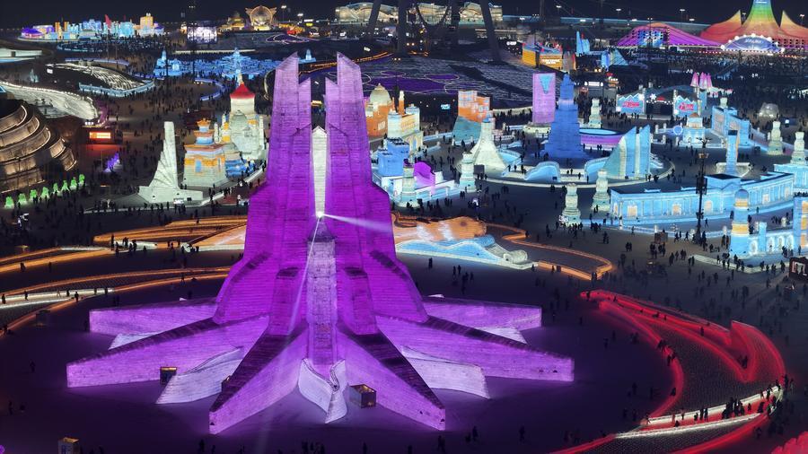 這是1月26日拍攝的第二十六屆哈爾濱冰雪大世界園區(qū)內(nèi)的第九屆亞冬會(huì)會(huì)徽冰雕,哈爾濱冰雪大世界將作為亞冬會(huì)開幕式的分會(huì)場(chǎng)(無(wú)人機(jī)照片)。新華社記者 王松 攝