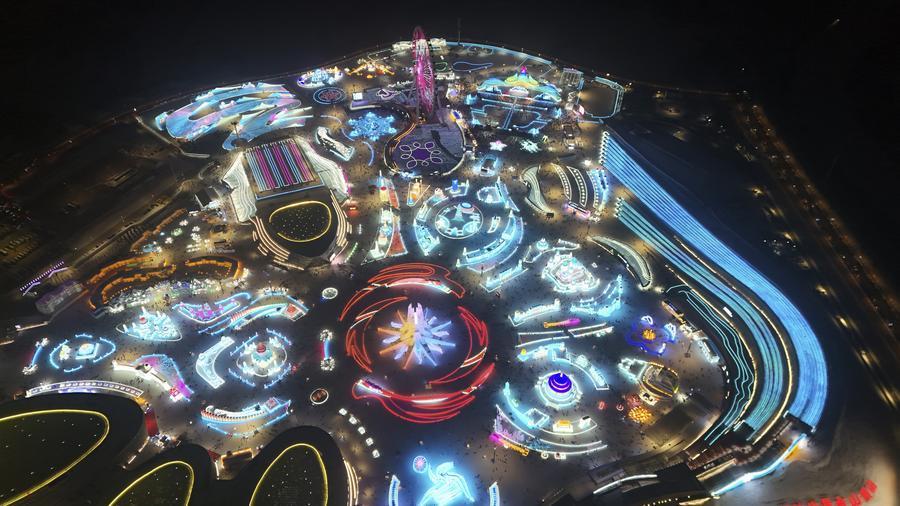 這是1月26日拍攝的第二十六屆哈爾濱冰雪大世界園區(qū),這里將作為亞冬會(huì)開幕式的分會(huì)場(chǎng)(無(wú)人機(jī)照片)。新華社記者 王松 攝