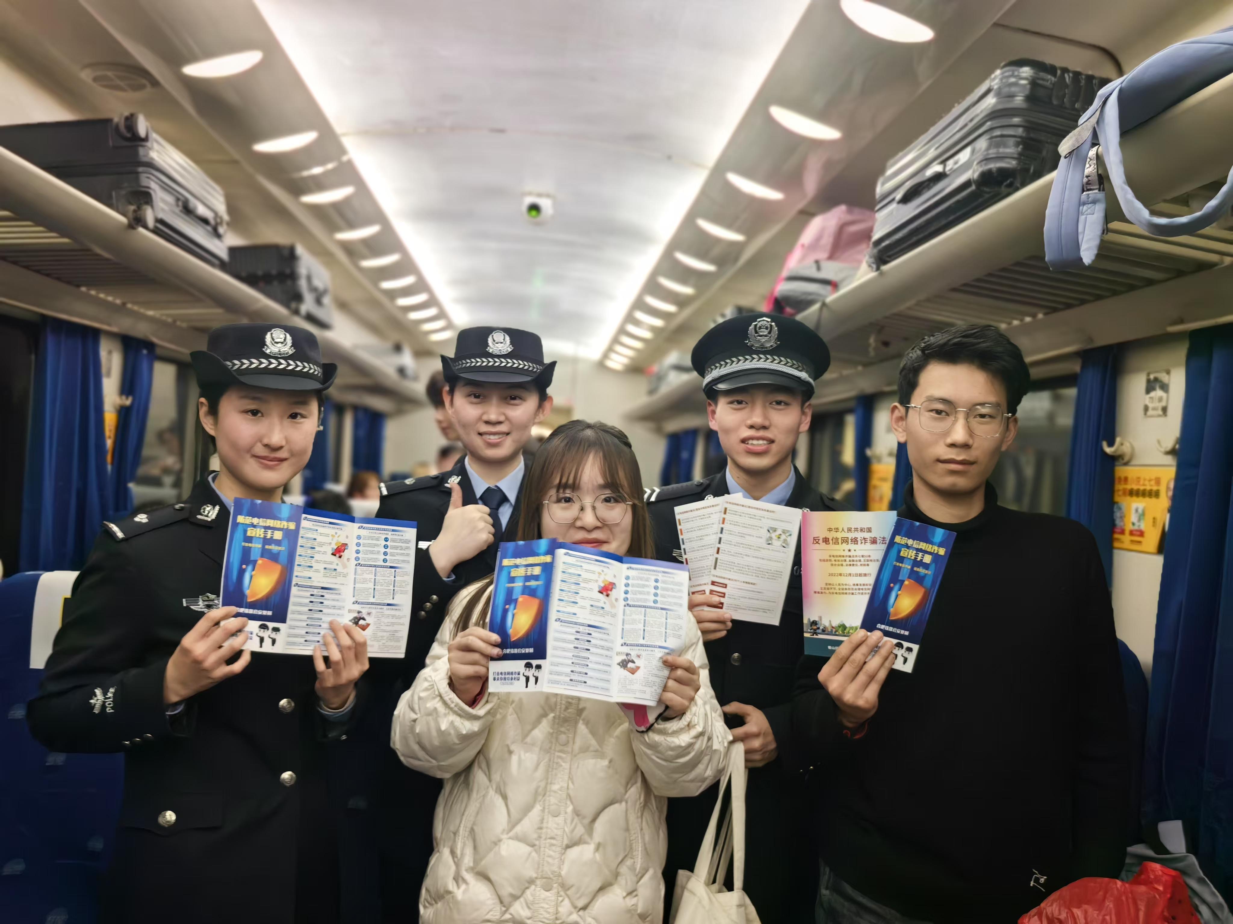 圖為民警與旅客手舉防范電信網(wǎng)絡詐騙宣傳手冊合影留念。