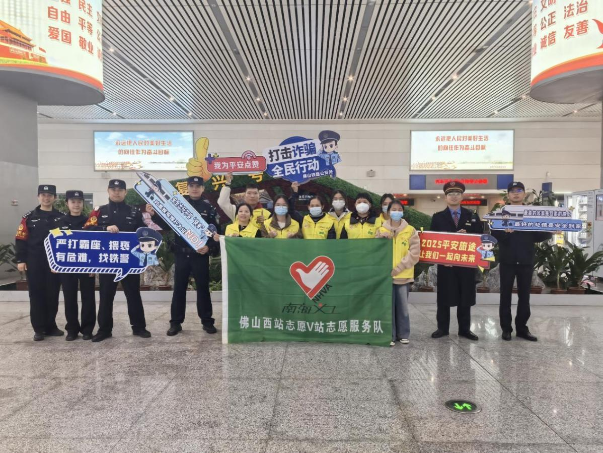 圖為佛山西站志愿V站志愿服務(wù)隊(duì)與執(zhí)勤民警的合影。通訊員 鄒轢瓊 攝