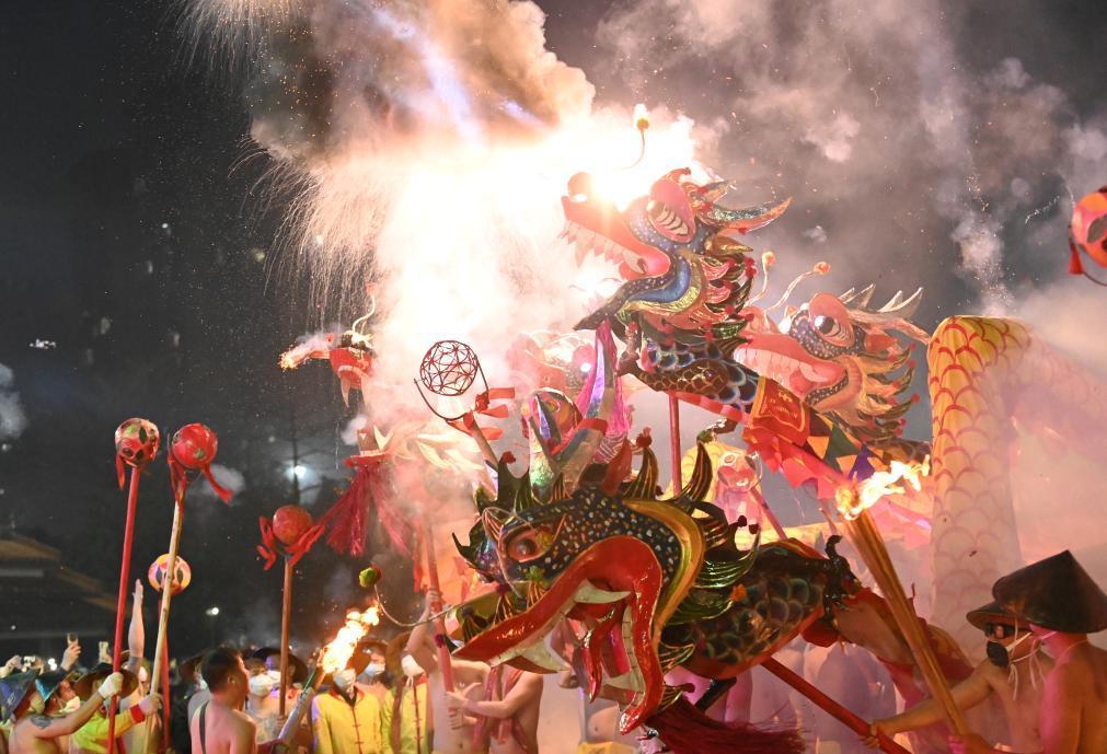 在廣西賓陽縣炮龍文化廣場,炮龍騰舞間火光閃爍。新華社記者陸波岸 攝