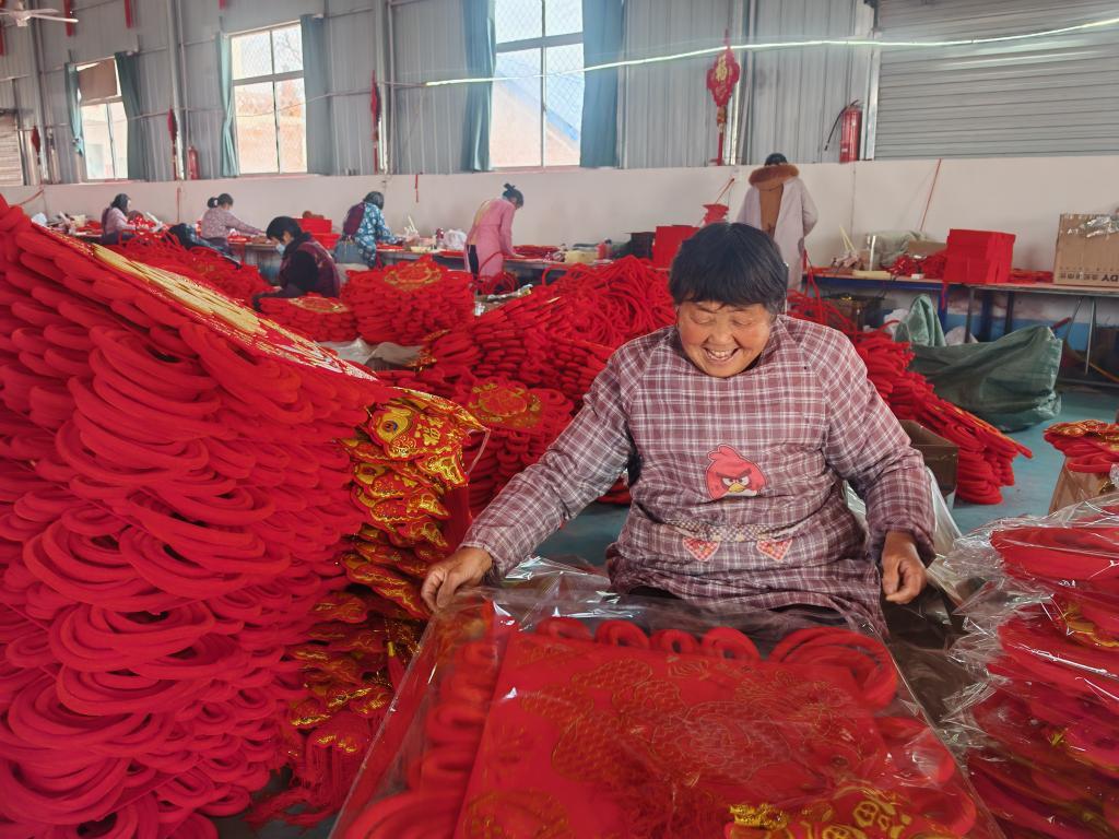 在河南省鄧州市陶營鎮(zhèn)王良村,村民正在整理編織完成的中國結(jié)。新華社發(fā)