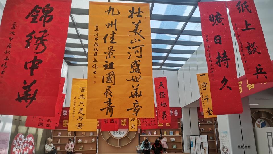 魏縣圖書(shū)館的四季童書(shū)閱覽區(qū)內(nèi)懸掛著書(shū)法條幅。魏縣縣委宣傳部供圖(王德峰 攝)