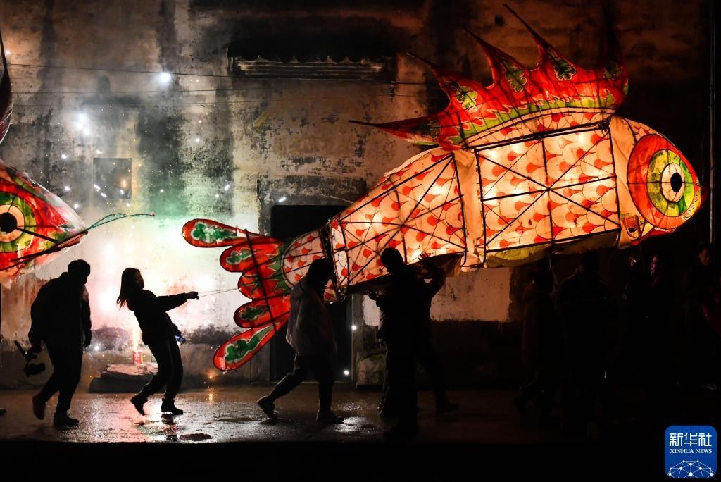 2021年2月26日,在安徽省黃山市歙縣溪頭鎮(zhèn)汪滿田村,游客和村民嬉魚燈,鬧元宵。新華社記者 韓旭 攝
