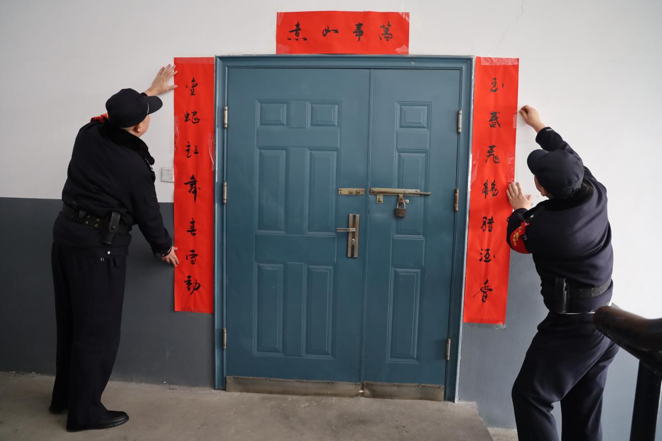春節(jié)前夕鹿泉監(jiān)獄干警在罪犯習(xí)藝車間門口張貼春聯(lián)。