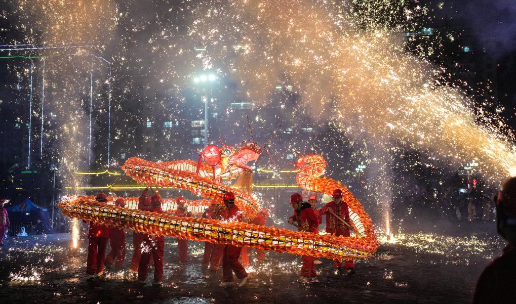 2月11日晚,人們?cè)谂_(tái)江縣參加“舞龍噓花”活動(dòng)。新華社記者 陶亮 攝