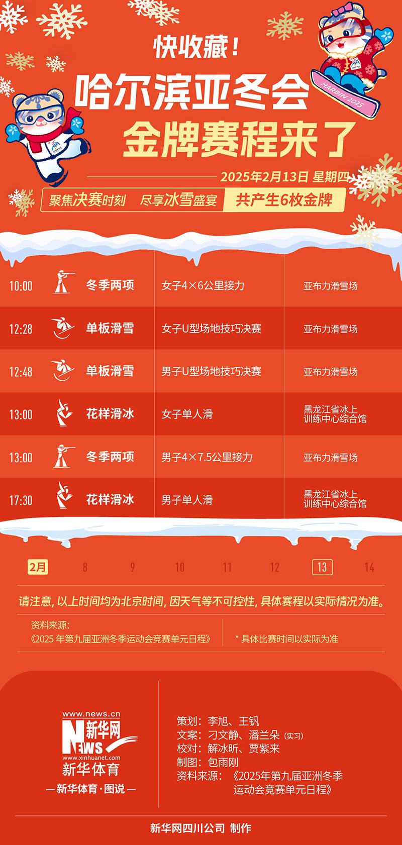 新華社哈爾濱2月12日電(記者許仕豪、王恒志)哈爾濱亞冬會13日將產生6塊金牌。在亞布力賽區(qū),單板滑雪U型場地技巧和冬季兩項接力賽將為雪上項目畫上句號。冰上方面,花樣滑冰將迎來男單、女單自由滑比賽。
