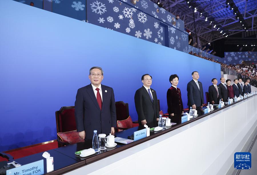 在《點(diǎn)亮亞洲》的樂曲聲中,李強(qiáng)同亞奧理事會(huì)第一副主席霍震霆等步入主席臺(tái),向觀眾揮手致意。