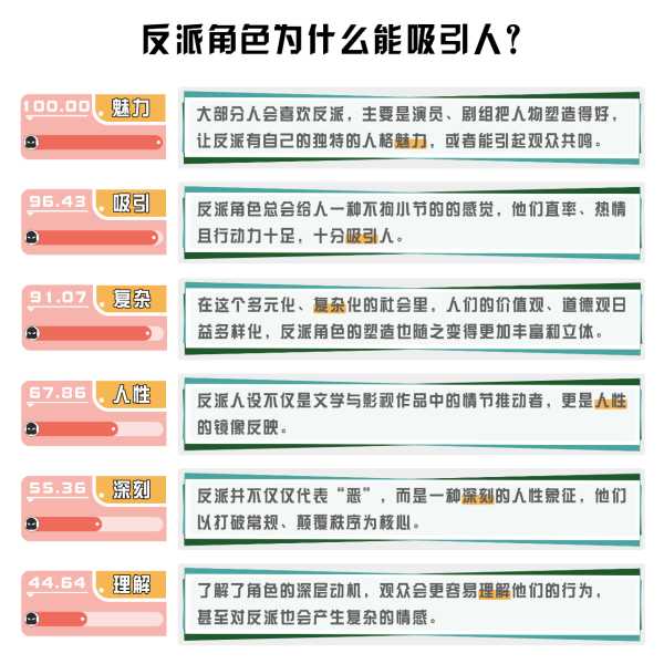 小紅書(shū)平臺(tái),搜集“為什么反派角色更吸引人?”相關(guān)貼文,整理分析后發(fā)現(xiàn),演員出色的演技是刻畫(huà)反派角色的基礎(chǔ)。令觀眾著迷的,往往是反派角色身上的多面性,反派角色的“惡”并不僅僅是字面意思,它是一種復(fù)雜的、深刻的人性象征,更像是一道令人捉摸不透的難解謎題。