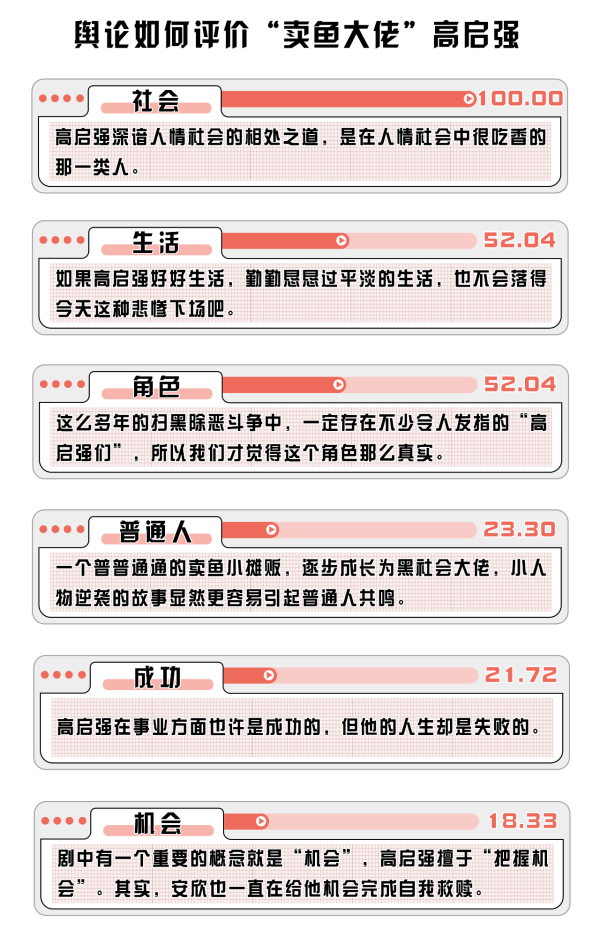 綜合輿論來(lái)看,有網(wǎng)民表示,掃黑除惡斗爭(zhēng)中,一定存在不少目無(wú)法紀(jì)的“高啟強(qiáng)”們,所以觀眾才會(huì)覺(jué)得這個(gè)角色如此真實(shí),“高啟強(qiáng)”們作惡多端,理應(yīng)受到法律的制裁;有網(wǎng)民評(píng)論稱(chēng),在人情社會(huì)的大環(huán)境下,高啟強(qiáng)正是因?yàn)樯朴诎盐諜C(jī)會(huì),才實(shí)現(xiàn)了身份轉(zhuǎn)變,但如果把犯罪作為通往成功的“登云梯”,那么結(jié)局一定是悲慘的;還有網(wǎng)民認(rèn)為,高啟強(qiáng)的成功是“罪惡的成功”,其身上散發(fā)的魅力是“惡之魅力”,如果利用“小人物逆襲”的故事鼓吹反派角色的“悲情魅力”,則極易模糊正義與邪惡的界限。