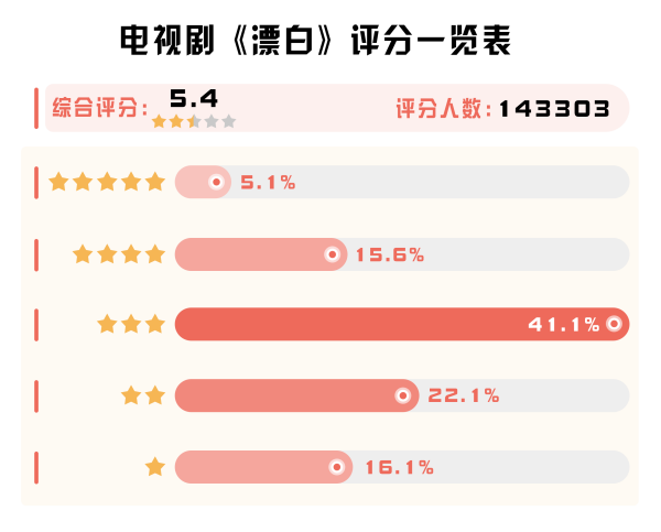 作為開(kāi)年熱播劇,《漂白》的豆瓣評(píng)分從最初的6分降為5.4分。在參與評(píng)分的14萬(wàn)余名觀眾中,41.1%的觀眾給出了三星,僅5.1%的觀眾給出了五星好評(píng)。跌破“及格線”的成績(jī)似乎并不理想,其中一個(gè)重要原因是該劇被指“過(guò)度美化反派”。