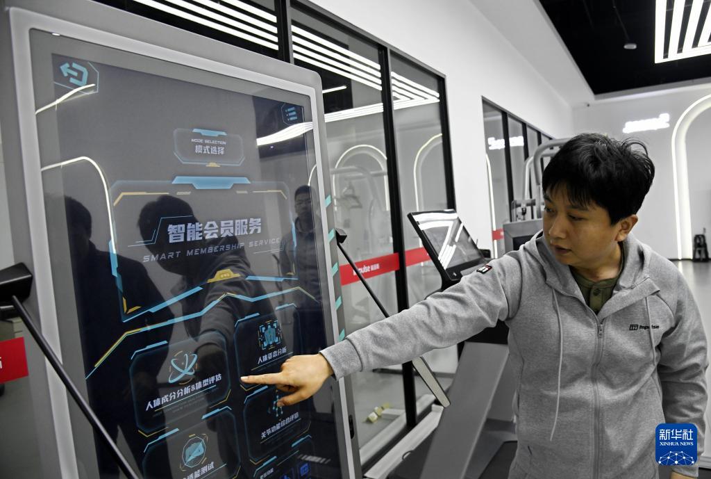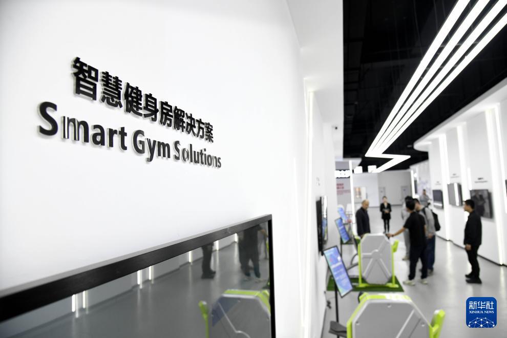 4月22日,參觀者在青島英派斯健康科技股份有限公司展廳內(nèi)了解智慧健身房解決方案。