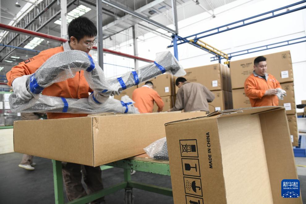 青島英派斯健康科技股份有限公司智慧工廠內(nèi)的自動(dòng)激光焊接機(jī)器人在作業(yè)(4月22日攝)。