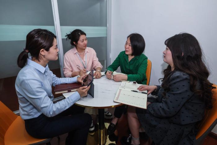 2025年4月17日,在浙江星程吉月智能科技有限公司,浙江杭州市富陽(yáng)經(jīng)濟(jì)技術(shù)開(kāi)發(fā)區(qū)助企服務(wù)專員(左二)、富陽(yáng)農(nóng)商銀行工作人員(左一)上門(mén)解決企業(yè)融資需求。新華社記者 徐昱 攝