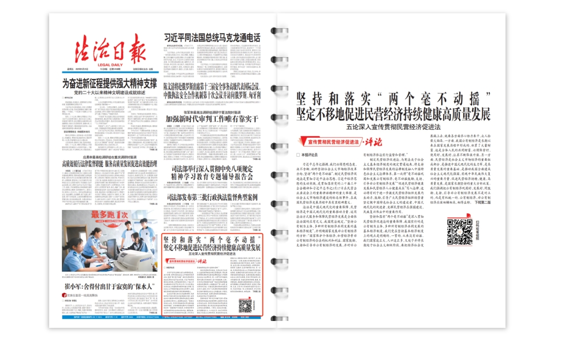 同舟共濟揚帆起,乘風(fēng)破浪萬里航。民營經(jīng)濟發(fā)展前景廣闊、大有可為。中國特色社會主義制度多方面的顯著優(yōu)勢,社會主義市場經(jīng)濟體制、中國特色社會主義法治體系不斷健全和完善,將為民營經(jīng)濟發(fā)展提供更為堅強的保障。讓我們更加緊密地團結(jié)在以習(xí)近平同志為核心的黨中央周圍,堅持和落實“兩個毫不動搖”,全面學(xué)習(xí)法律內(nèi)容,深入領(lǐng)會法律精神,堅決落實法律規(guī)定,更加自覺地運用法治思維和法治方式做好民營經(jīng)濟工作,共同促進民營經(jīng)濟在法治的軌道上持續(xù)、健康、高質(zhì)量發(fā)展。