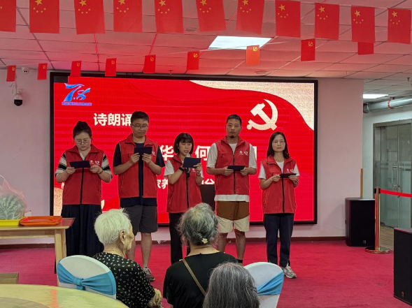 值此“七一”前夕,志愿者們把精心準(zhǔn)備的紅色詩(shī)朗誦《何以華夏 何以中國(guó)》送給老人們。志愿者們深情飽滿的演繹,吟誦出華夏大地的輝煌歷史與文化底蘊(yùn),讓在場(chǎng)的每一位中華兒女為之自豪。