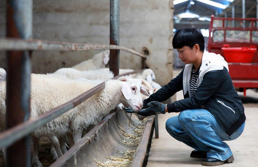 在富民新村養(yǎng)殖區(qū)的養(yǎng)殖暖棚內,養(yǎng)殖戶蒲萬林在查看肉羊長勢。新華社記者 郭剛 攝