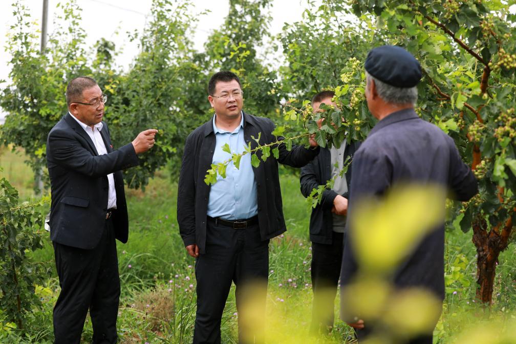 在富民新村的經濟林栽植區(qū),古浪縣委組織部常務副部長俞永文(左二)與富民新村黨委書記兼村委會主任張延堂(左一)在和種植戶交流。新華社記者 郭剛 攝