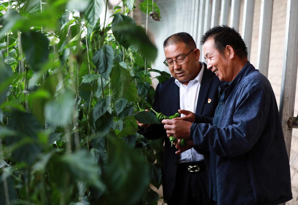 在富民新村種植區(qū)的日光溫室內,富民新村黨委書記兼村委會主任張延堂(左)在與種植戶何振田查看辣椒長勢。新華社記者 郭剛 攝