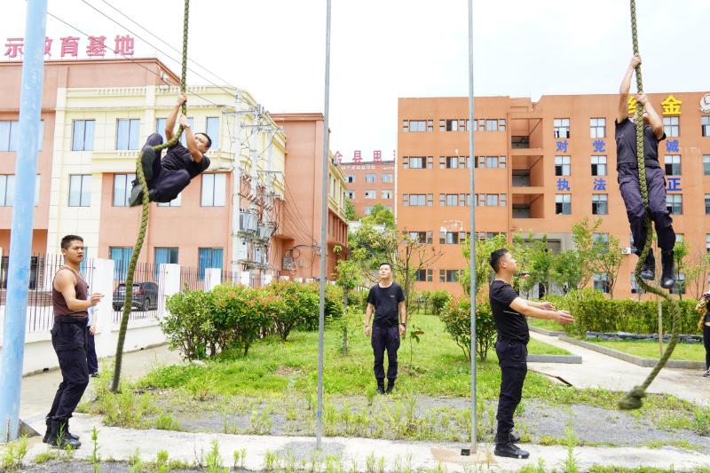 在隨后的大練兵活動中,特警隊員們開展了多項科目的訓練?!邦A備,開始!”教官一聲令下,兩名特警隊員如離弦之箭,猛地蹬地起躍,雙手緊扣垂下的繩索,腰腹與雙臂協(xié)同發(fā)力,如同矯健的壁虎迅速向上攀爬,展現(xiàn)出卓越的體能和攀爬技巧。