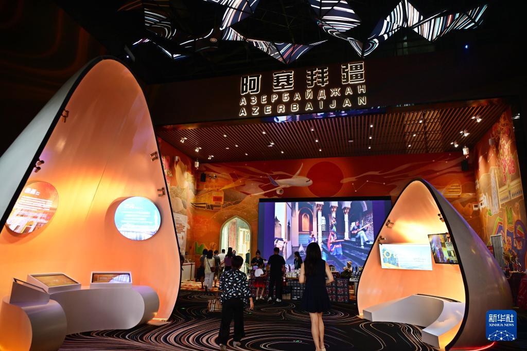 7月18日,與會(huì)者在青島·上合之珠國(guó)際博覽中心阿塞拜疆館內(nèi)參觀。